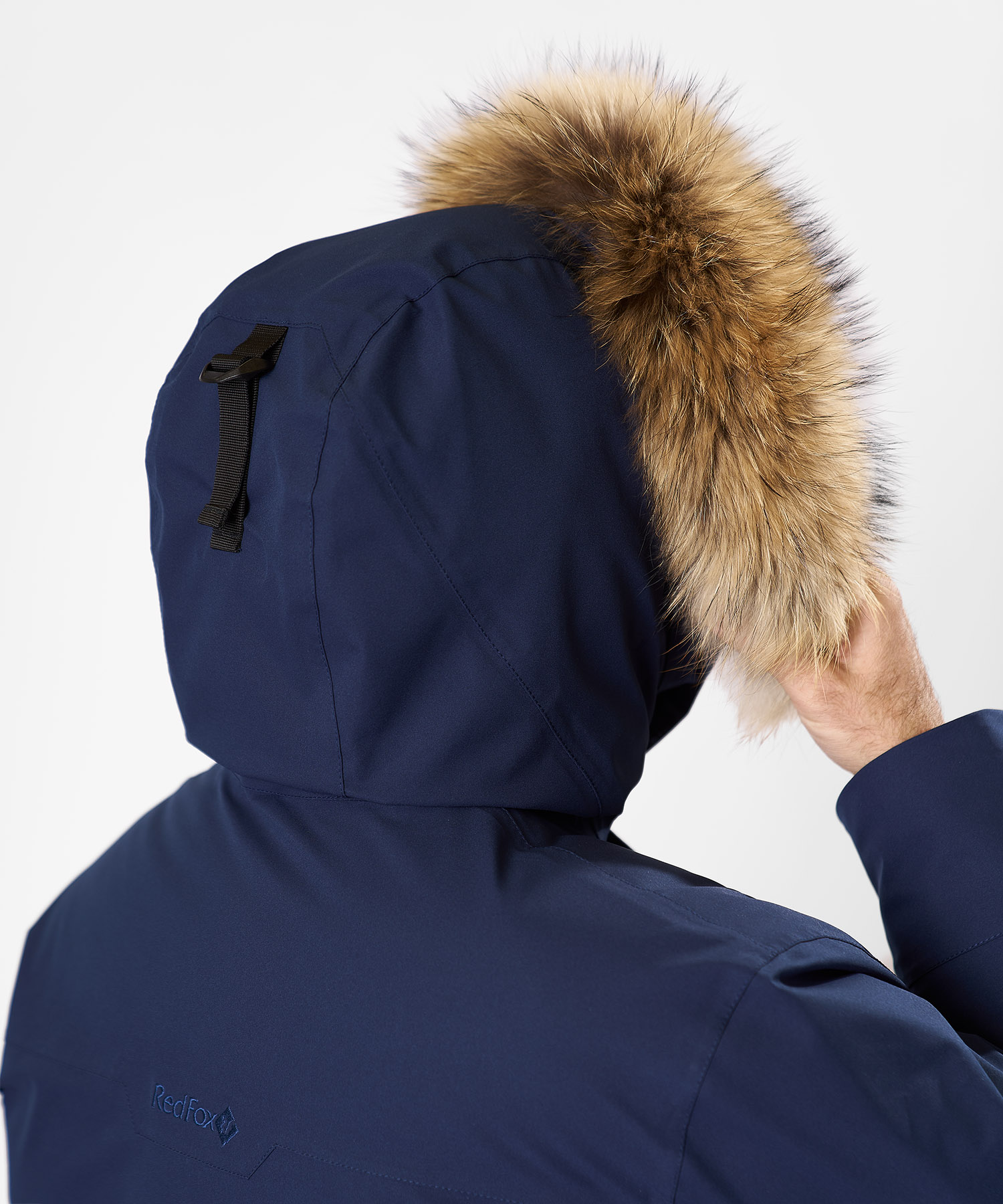 - Съёмная опушка из натурального меха енота на кнопках — защищает лицо от обморожения, легко снимается для ухода
