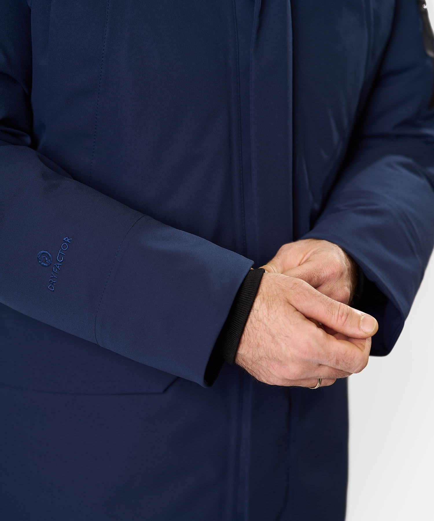 - Внешний материал: Dry Factor® Pro (100% полиэстер, 170 г/м²) — мембранная ткань с водонепроницаемостью 10 000 мм, паропроницаемостью 10 000 г/м²/24 ч и водоотталкивающей пропиткой DWR. Надёжно защищает от снега, дождя и ветра, не задерживая влагу внутри.