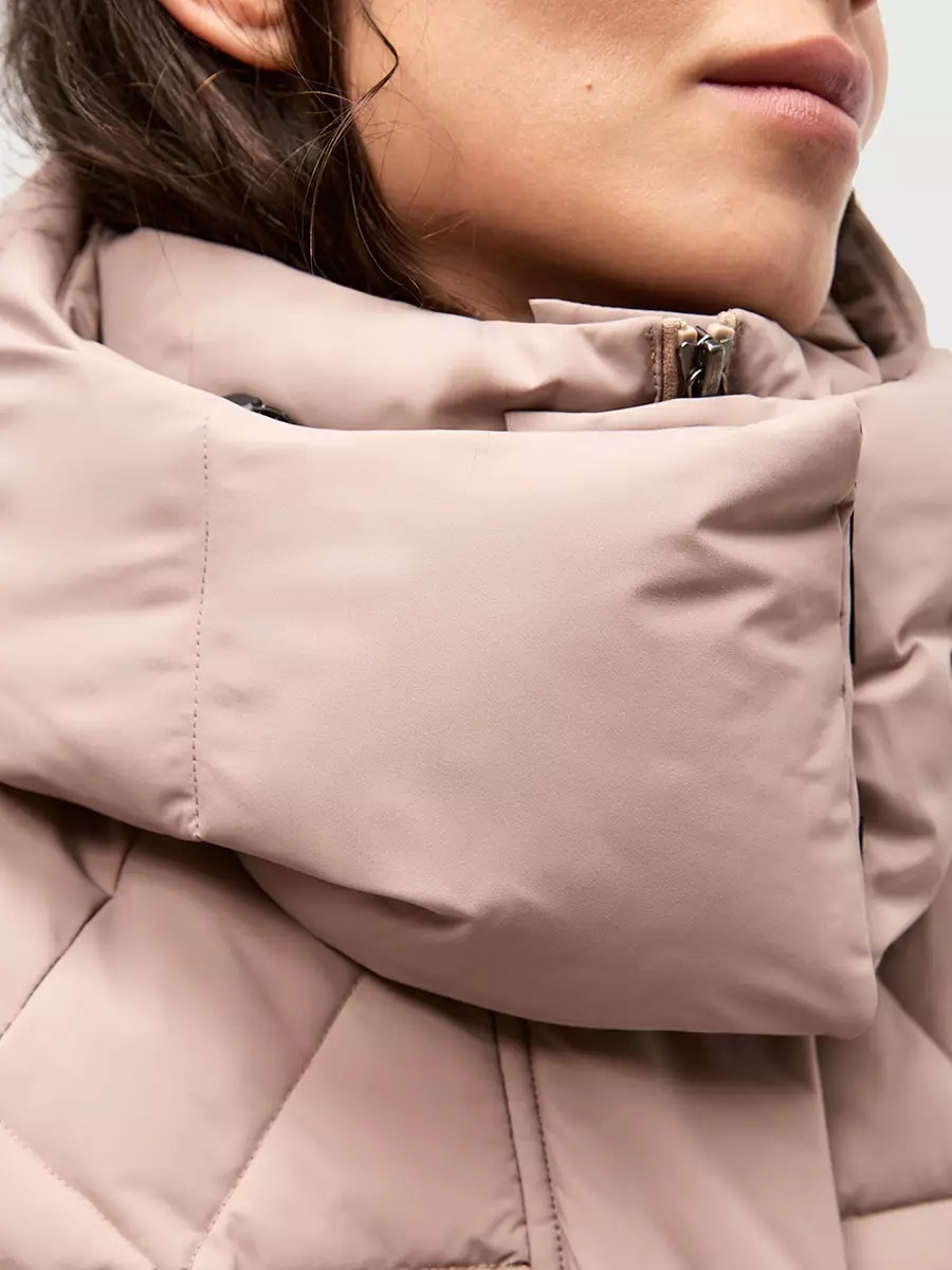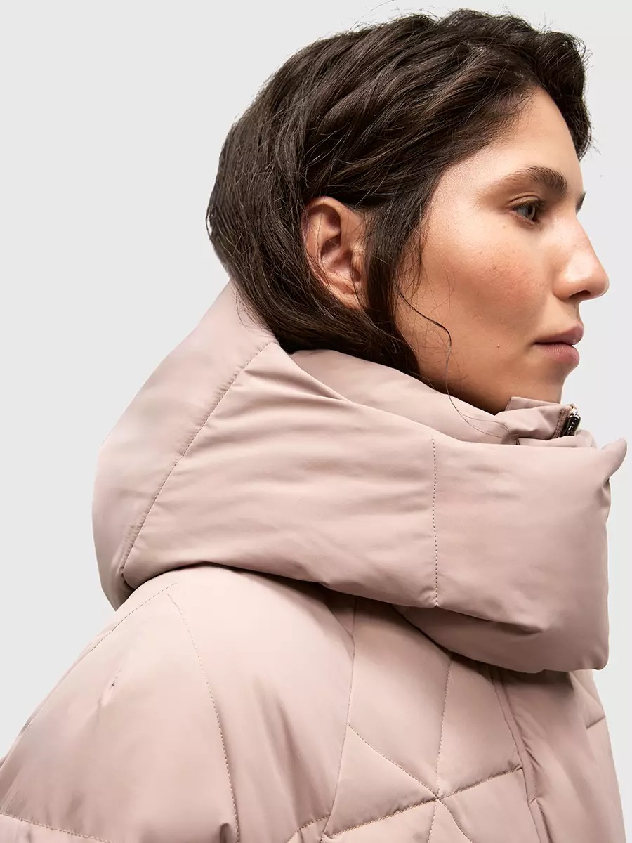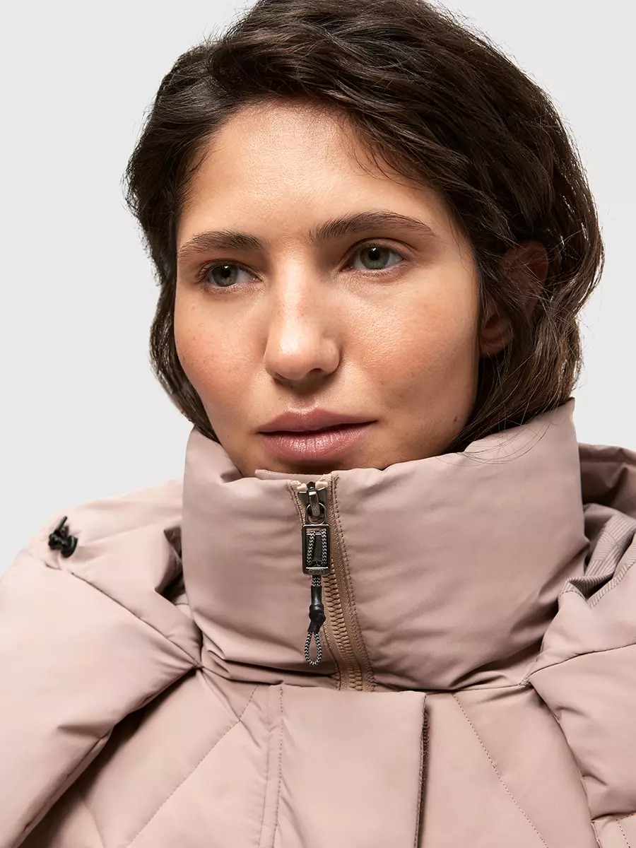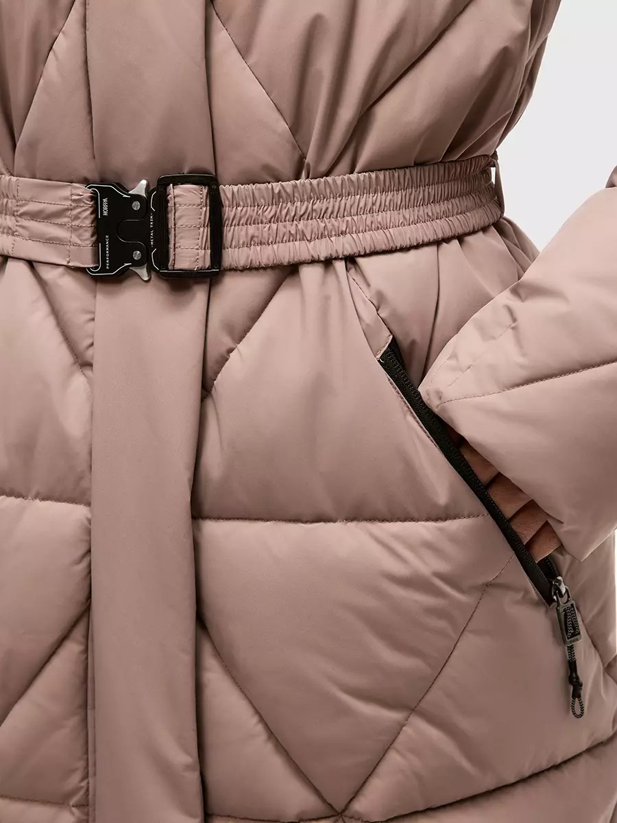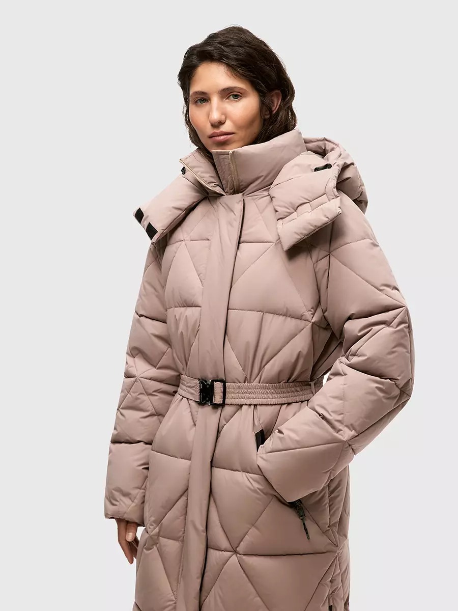 Одна из жемчужин коллекции - зимнее пальто ASHKAVA на функциональном поясе с графичным рисунком стежки. Его дизайн вдохновлен самой природой: причудливым узором трещин на поверхности льда.