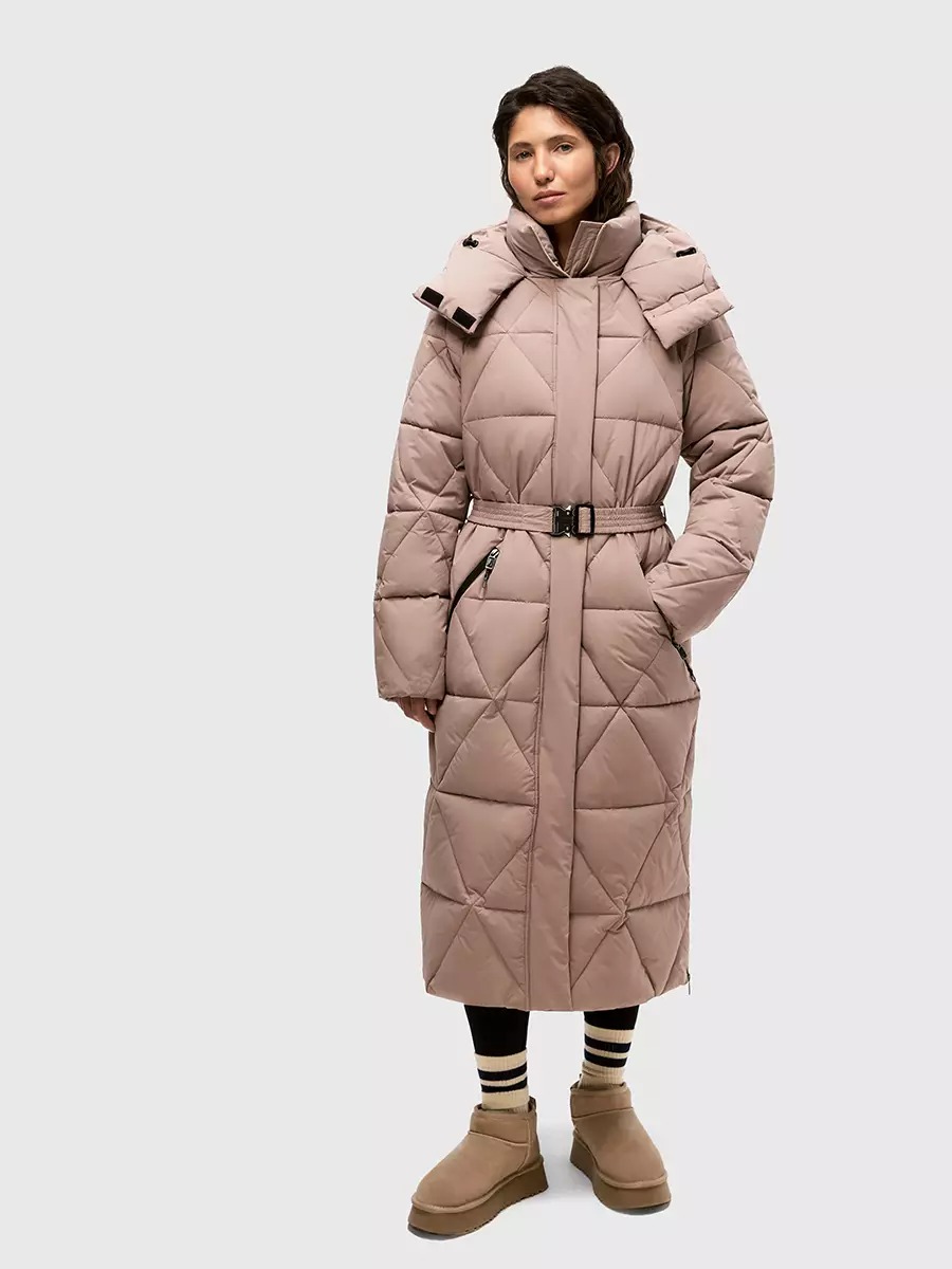 Одна из жемчужин коллекции - зимнее пальто ASHKAVA на функциональном поясе с графичным рисунком стежки. Его дизайн вдохновлен самой природой: причудливым узором трещин на поверхности льда.