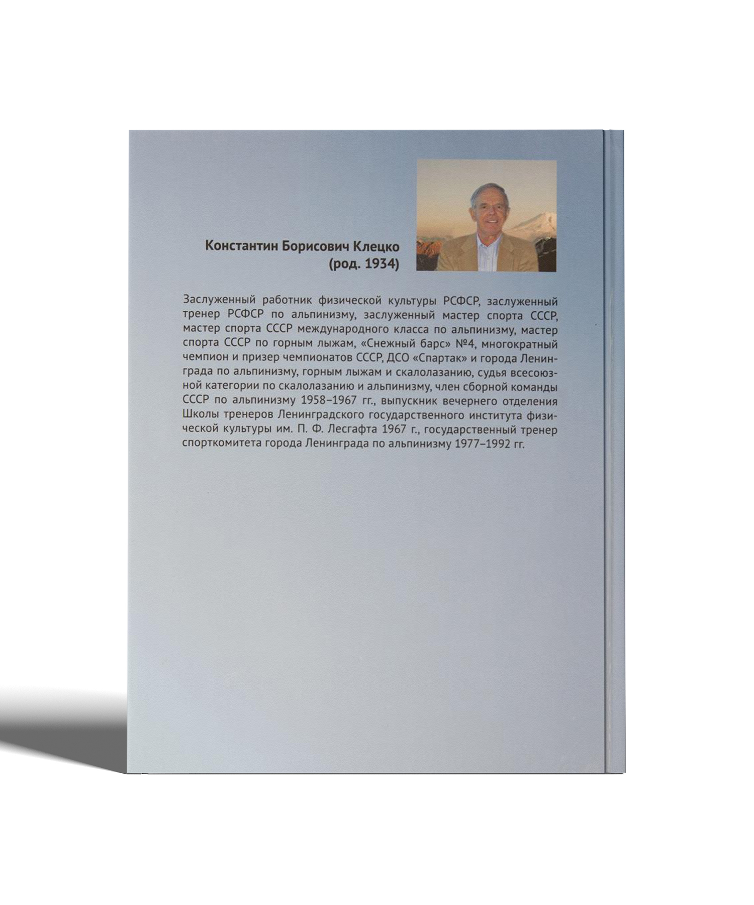 Автор книги "Мгновения, принесённые с вершин", Константин Борисович Клецко - Заслуженный работник физической культуры РСФСР, Заслуженный тренер РСФСР по альпинизму, Заслуженный Мастер спорта по альпинизму, МСМК по альпинизму (1966), Мастер спорта по горным лыжам, Снежный Барс №4, многократный чемпион и призер чемпионатов СССР, ДСО "Спартак" и Ленинграда по альпинизму, горным лыжам и скалолазанию. Судья Всесоюзной категории по скалолазанию и альпинизму. Член Сборной команды СССР по альпинизму 1958075 гг. Член Сборной команды ДСО "Спартак" и Ленинграда по горным лыжам 1954-67 гг. Выпускник вечернего отделения Школы тренеров Института им. Лесгафта 1967 г. Государственный тренер Спорткомитета Ленинграда по альпинизму 1977-92 гг.