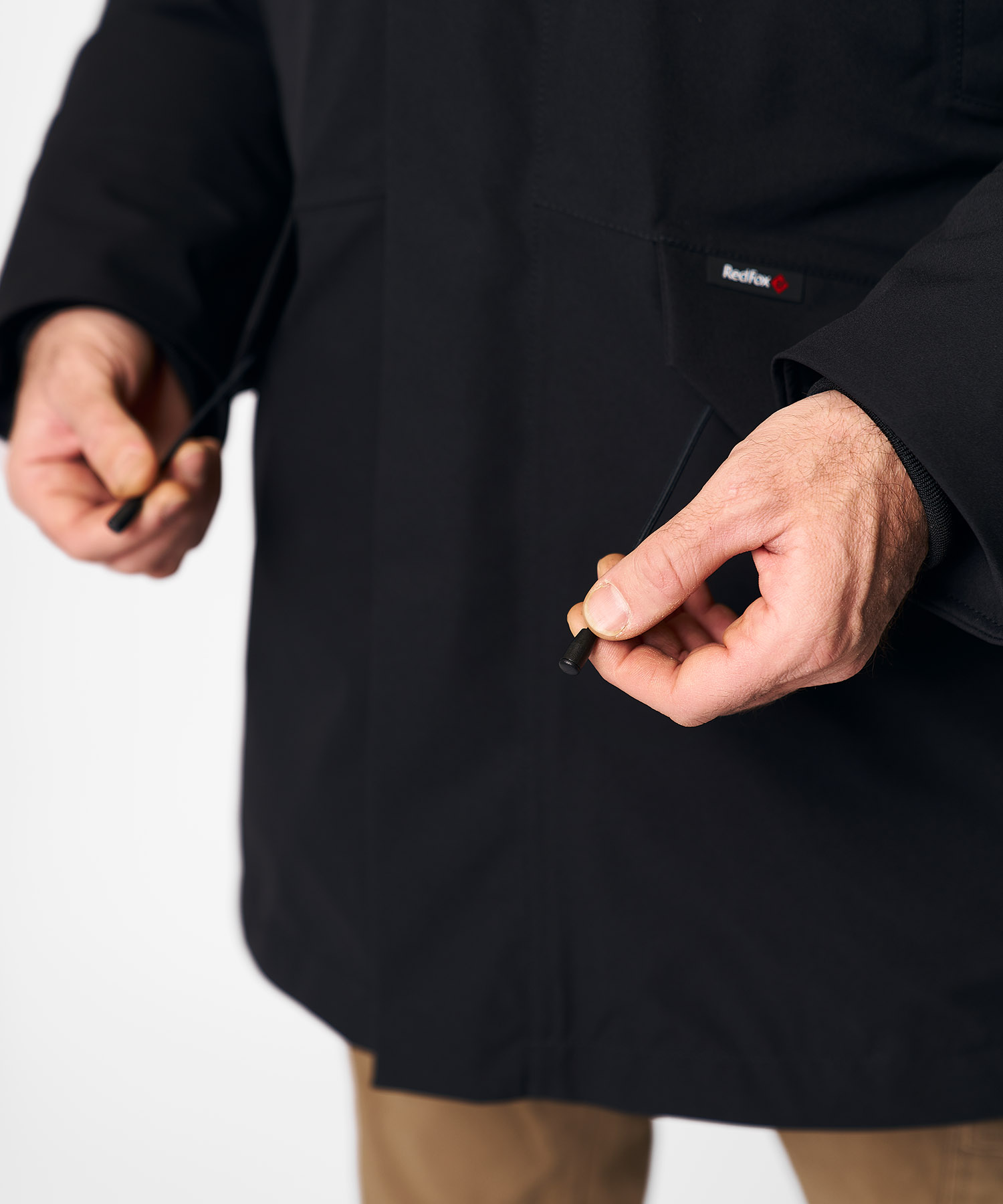 - Регулировка объёма по талии, механизмы выведены внутрь боковых карманов — точная подгонка без внешних шнуровок