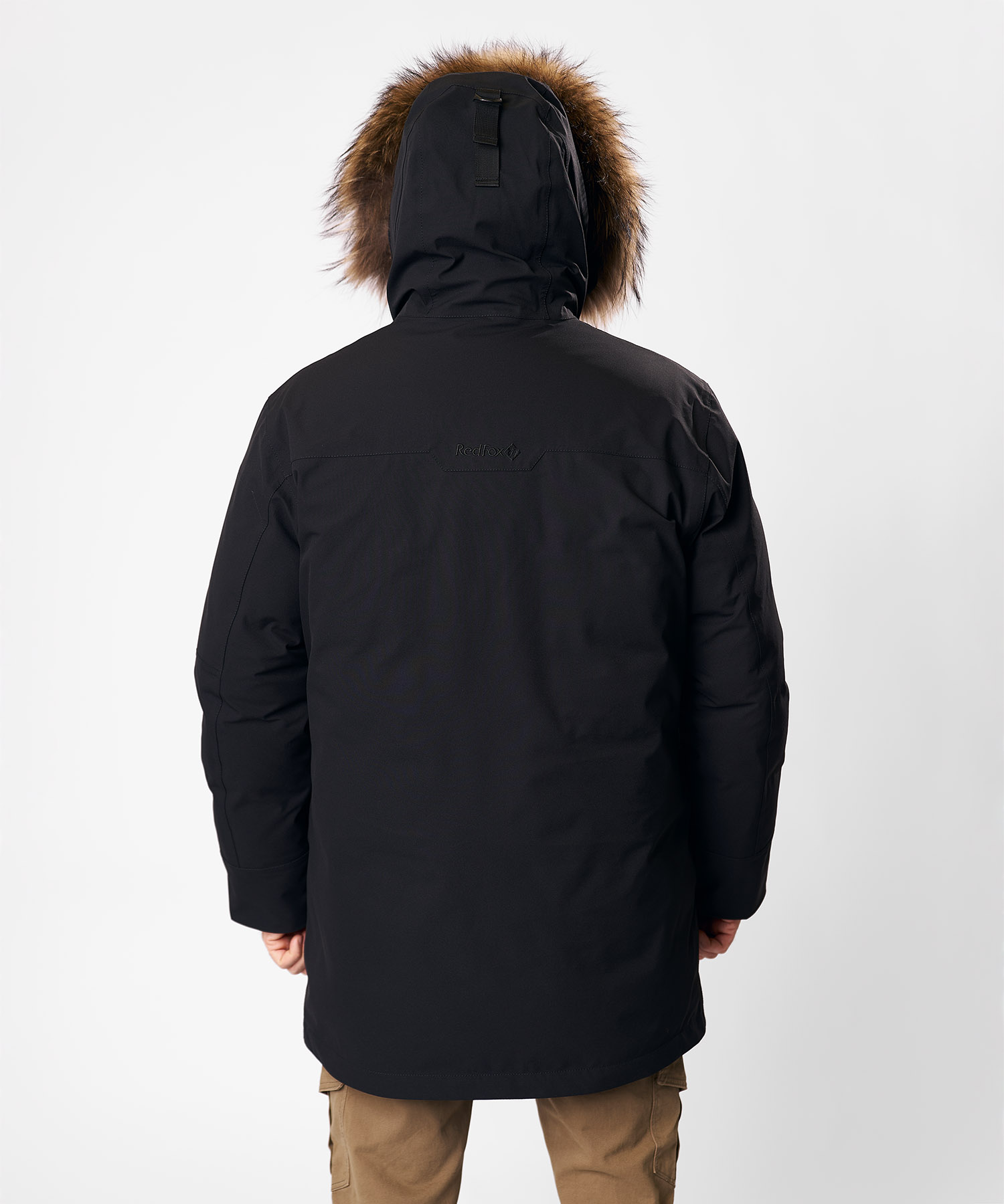 - Съёмная опушка из натурального меха енота на кнопках — защищает лицо от обморожения, легко снимается для ухода