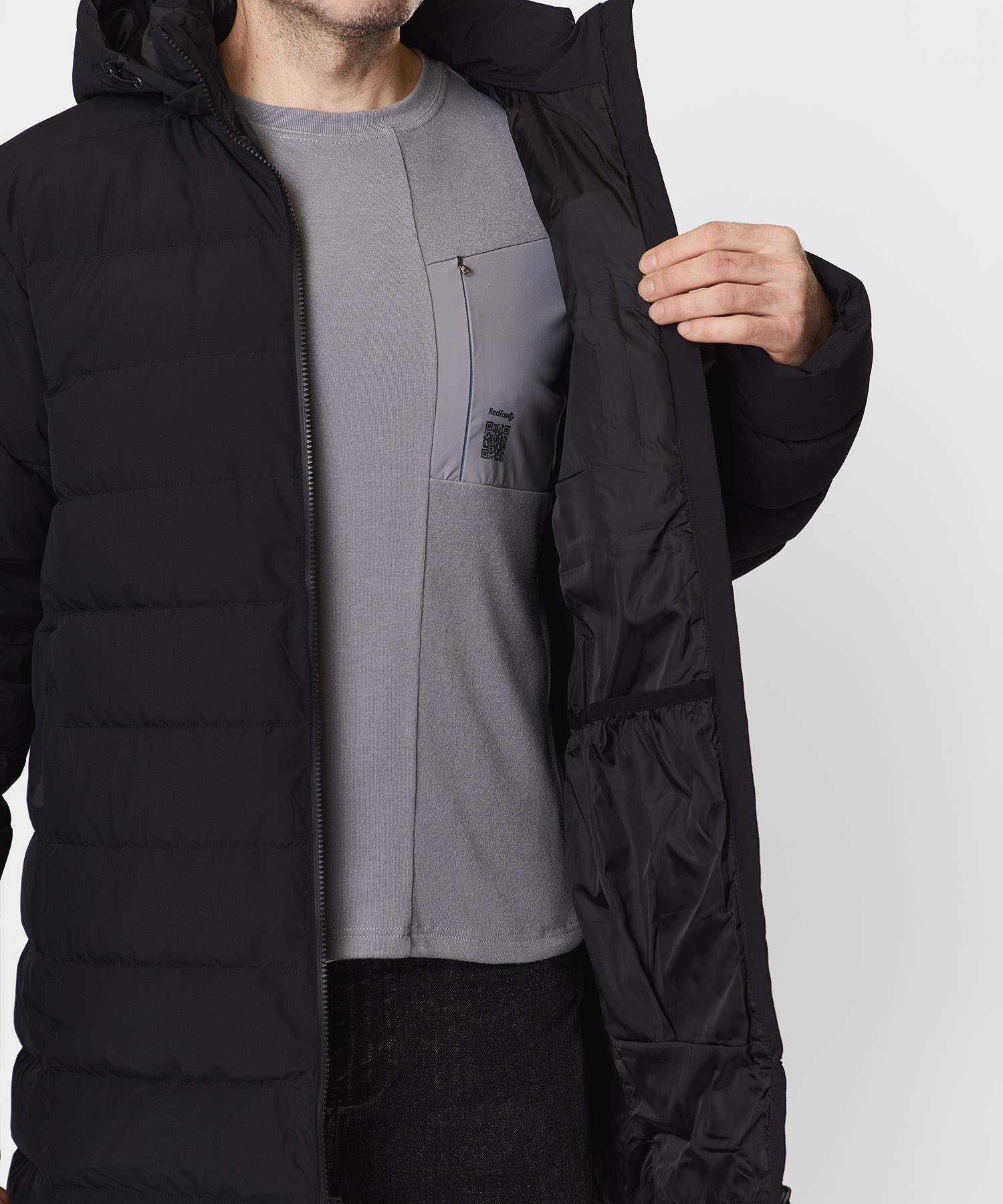 • Нагрудный карман с влагозащитной молнией — для быстрого доступа к мелочам в дождь или снег