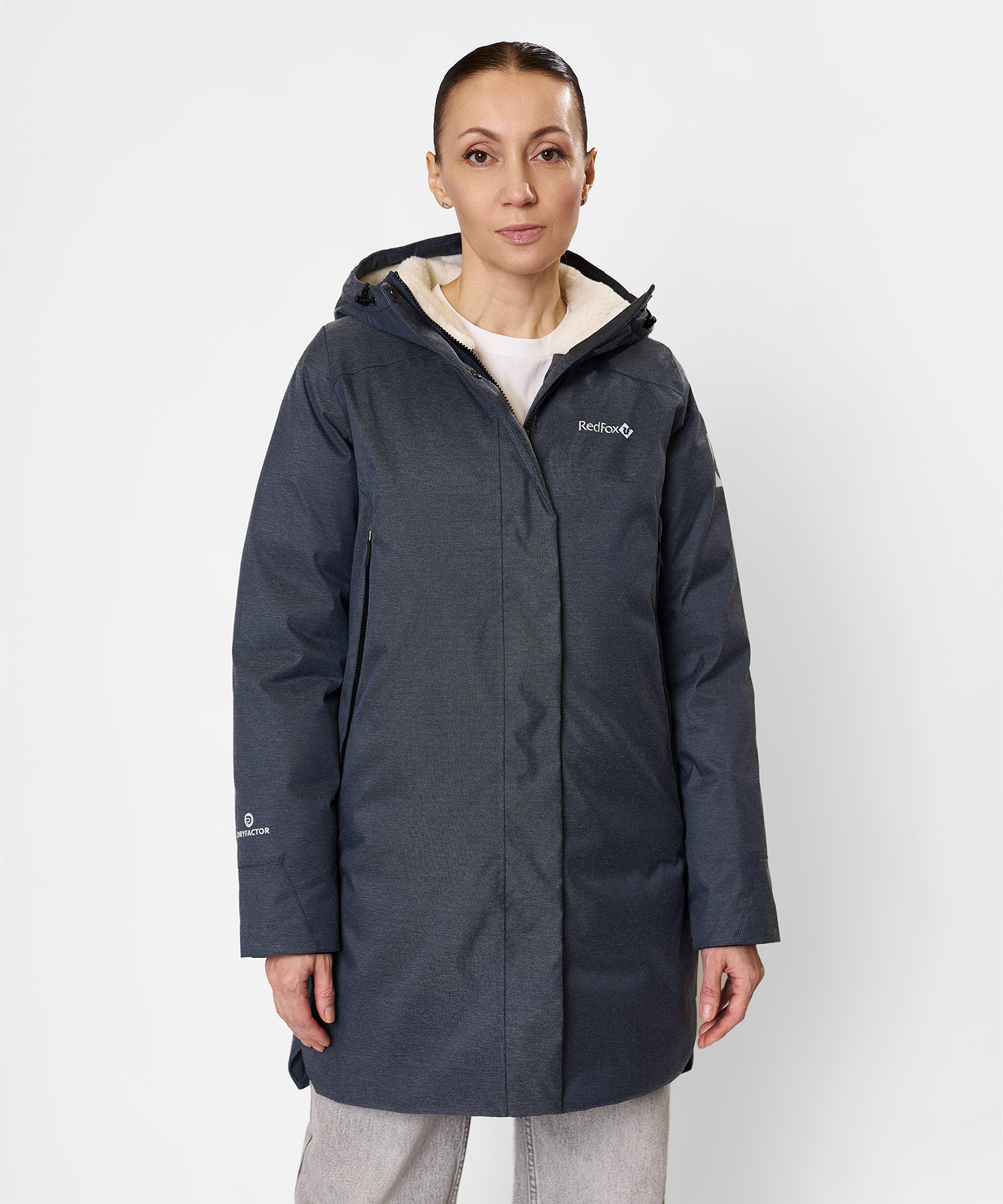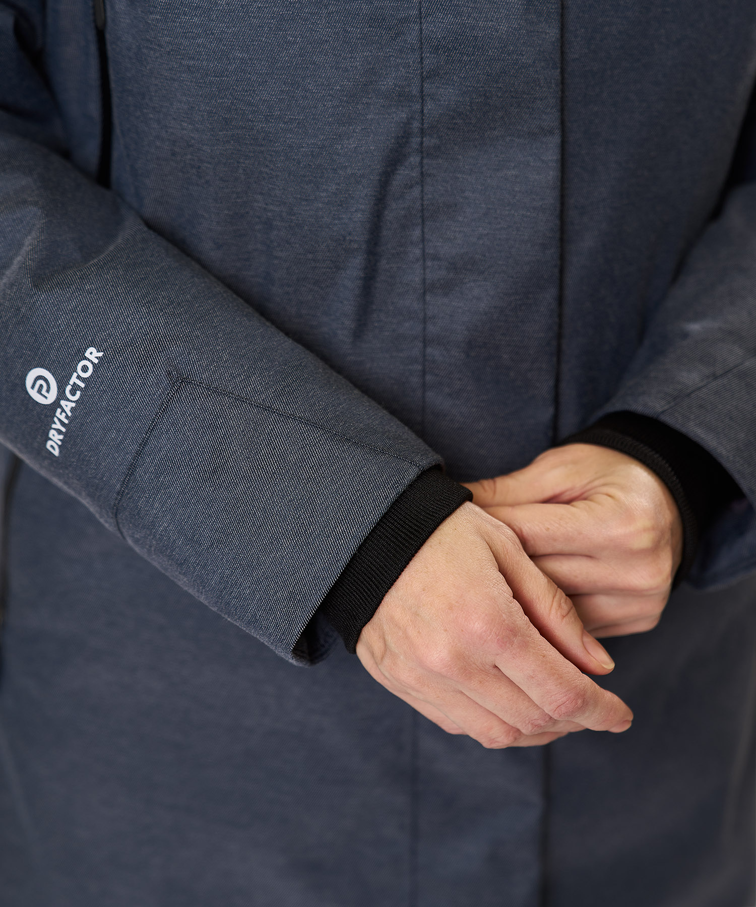 • Внешний материал: Dry Factor® Advance (100% полиэстер, 171 г/м²) — мембранная ткань с водонепроницаемостью 5000 мм, дышимостью 5000 г/м²/24 ч и водоотталкивающей пропиткой DWR. Надёжно защищает от снега, дождя и ветра.