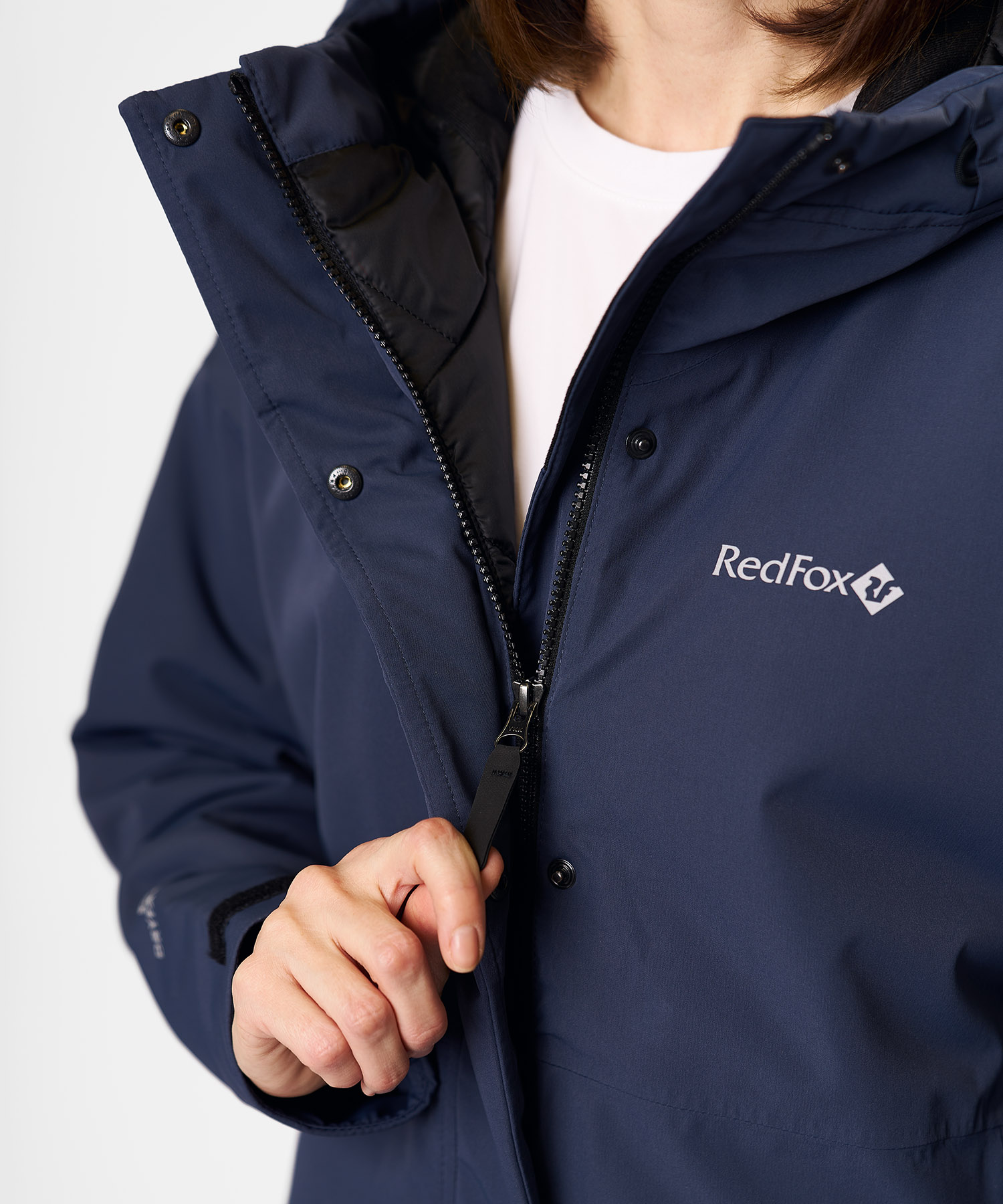 - Внешний материал: Dry Factor® Advance (100% полиэстер, 169 г/м²) — мембранная ткань с водонепроницаемостью 5000 мм, паропроницаемостью 5000 г/м²/24 ч и водоотталкивающей пропиткой DWR. Надёжно защищает от дождя и ветра, при этом остаётся лёгкой и комфортной.