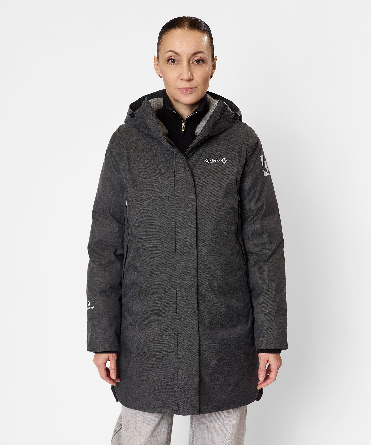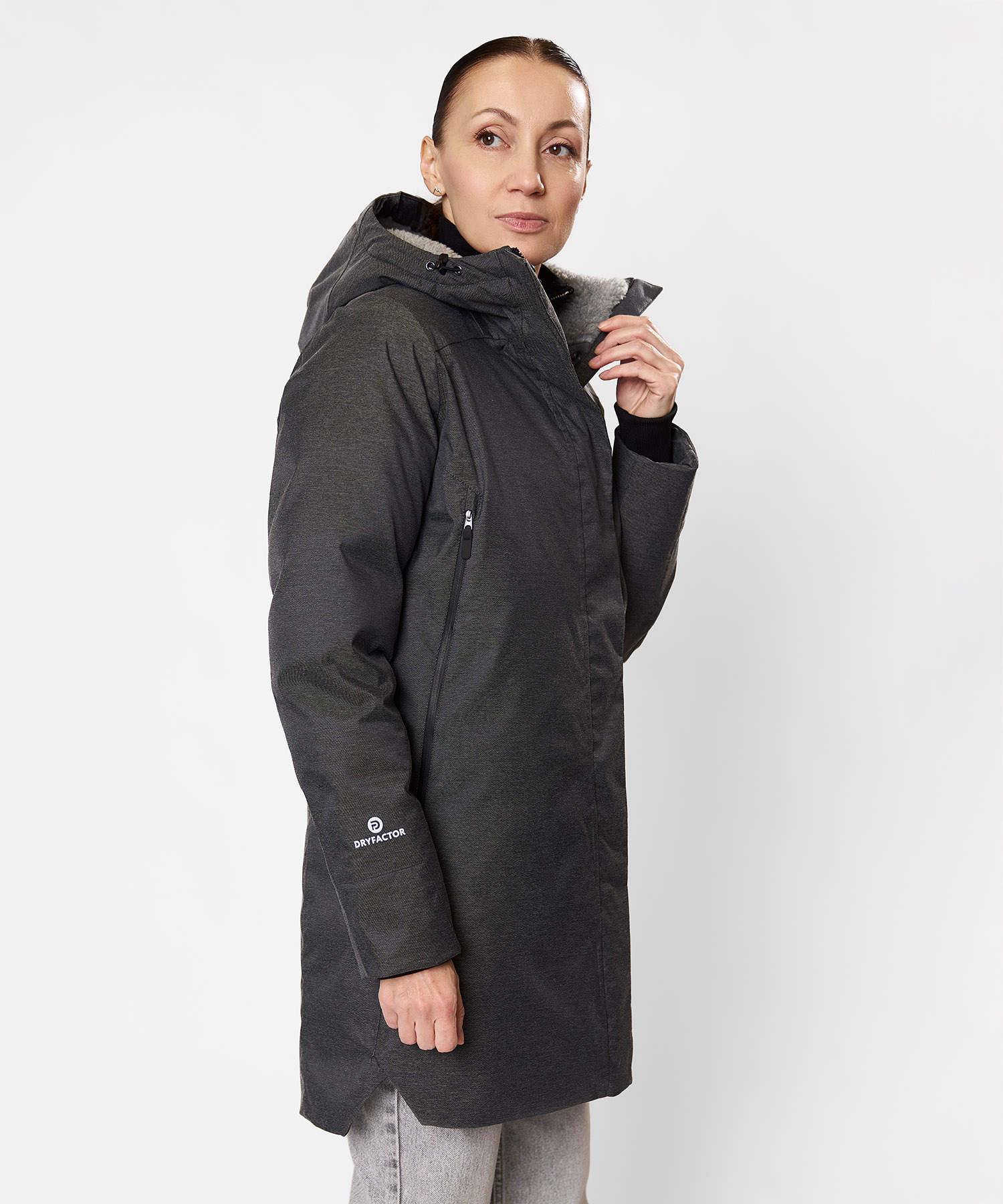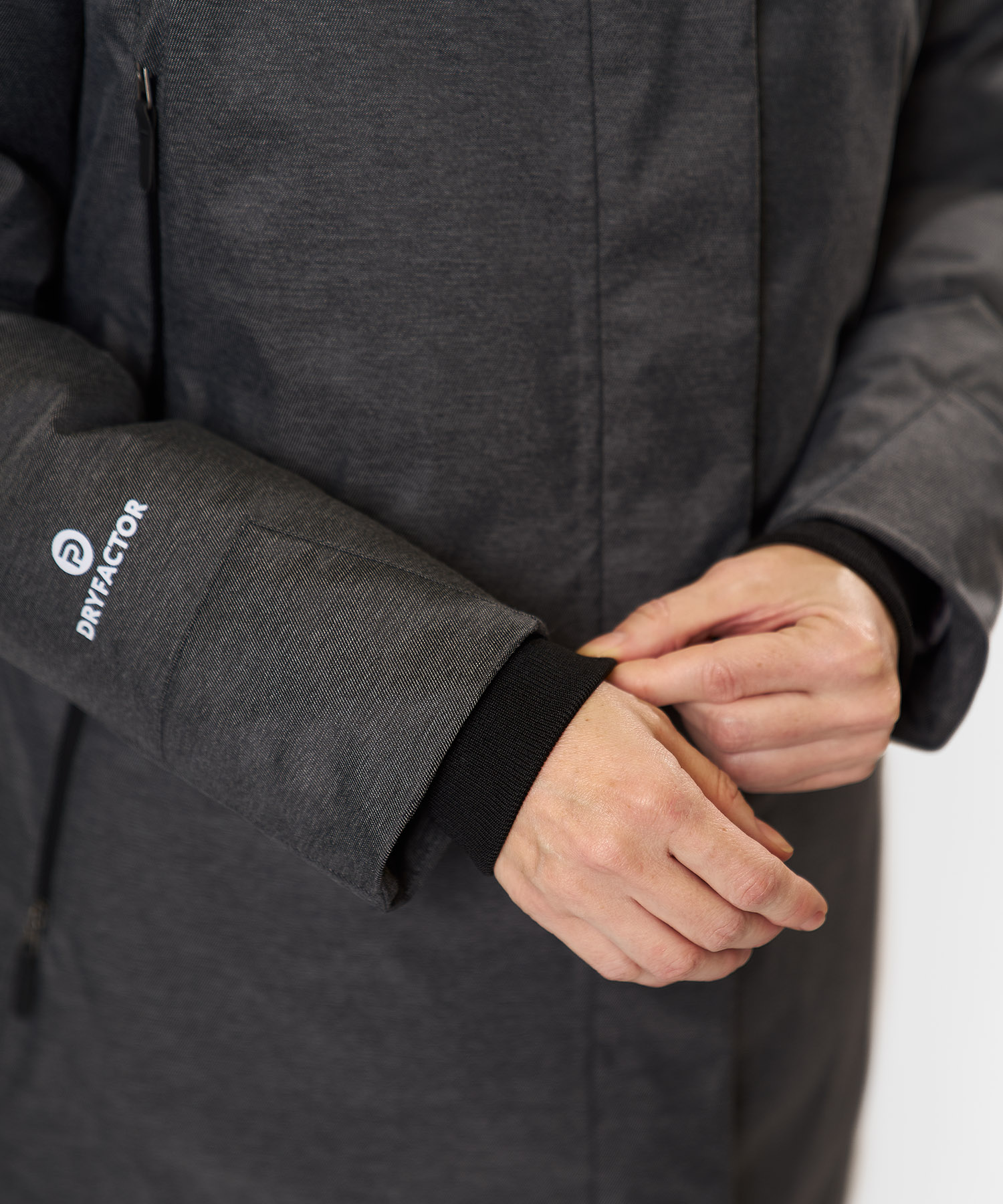 • Внешний материал: Dry Factor® Advance (100% полиэстер, 171 г/м²) — мембранная ткань с водонепроницаемостью 5000 мм, дышимостью 5000 г/м²/24 ч и водоотталкивающей пропиткой DWR. Надёжно защищает от снега, дождя и ветра.